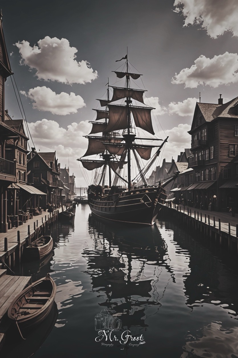 Im nebelverhangenen Hafen von Blackmoor liegt ein geheimnisvolles Segelschiff vor Anker: die „Das Schiff der Schattenwinde“. Ein alter Mythos besagt, dass dieses Schiff nur bei Vollmond erscheint, wenn das Wasser wie schwarzes Glas glänzt und die Luft von einer unheimlichen Stille erfüllt ist. Die Segel, durchzogen von rissigen Linien und dunklem Stoff, fangen keinen Wind – und doch bewegt sich das Schiff scheinbar von selbst.